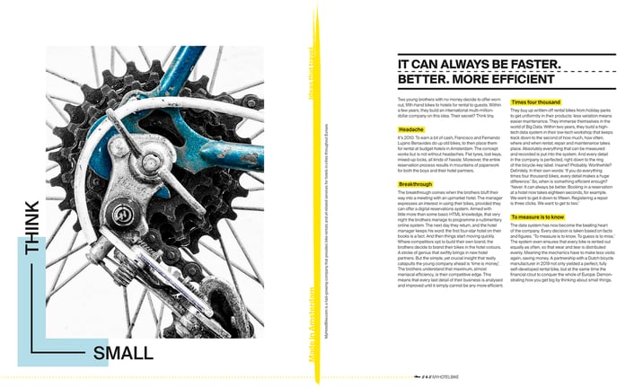 They buy up written-off rental bikes from holiday parks to get uniformity in their products: less variation means easier maintenance. They immerse themselves in the world of Big Data. Within two years, they build a high- tech data system in their low-tech workshop that keeps track down to the second of how much, how often, where and when rental, repair and maintenance takes place. Absolutely everything that can be measured and recorded is put into the system. And every detail in the company is perfected, right down to the ring of the bicycle-key label. Insane? Probably. Worthwhile? Definitely. In their own words: ‘If you do everything times four thousand bikes, every detail makes a huge difference.’ So, when is something efficient enough? ‘Never. It can always be better. Booking in a reservation at a hotel now takes eighteen seconds, for example. We want to get it down to fifteen. Registering a repair is three clicks. We want to get to two.’