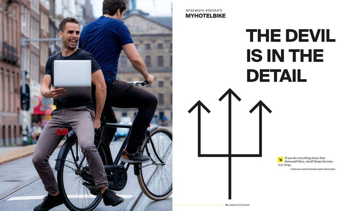 The breakthrough comes when the brothers bluff their way into a meeting with an upmarket hotel. The manager expresses an interest in using their bikes, provided they can offer a digital reservations system. Armed with little more than some basic HTML knowledge, that very night the brothers manage to programme a rudimentary online system. The next day they return, and the hotel manager keeps his word: the first four-star hotel on their books is a fact. And then things start moving quickly. Where competitors opt to build their own brand, the brothers decide to brand their bikes in the hotel colours. A stroke of genius that swiftly brings in new hotel partners. But the simple, yet crucial insight that really catapults the young company ahead is ‘time is money’. The brothers understand that maximum, almost maniacal efficiency, is their competitive edge. This means that every last detail of their business is analysed and improved until it simply cannot be any more efficient.